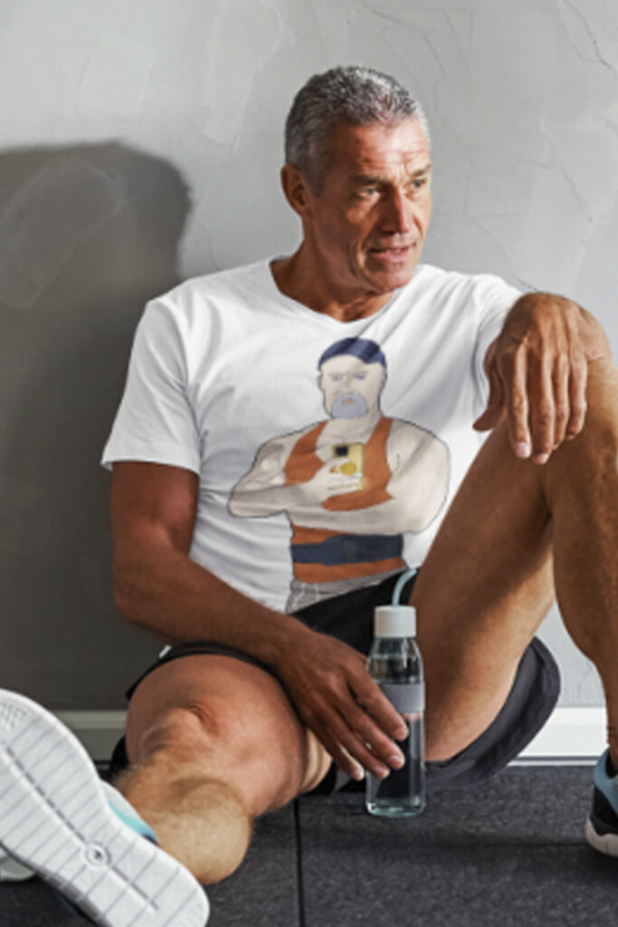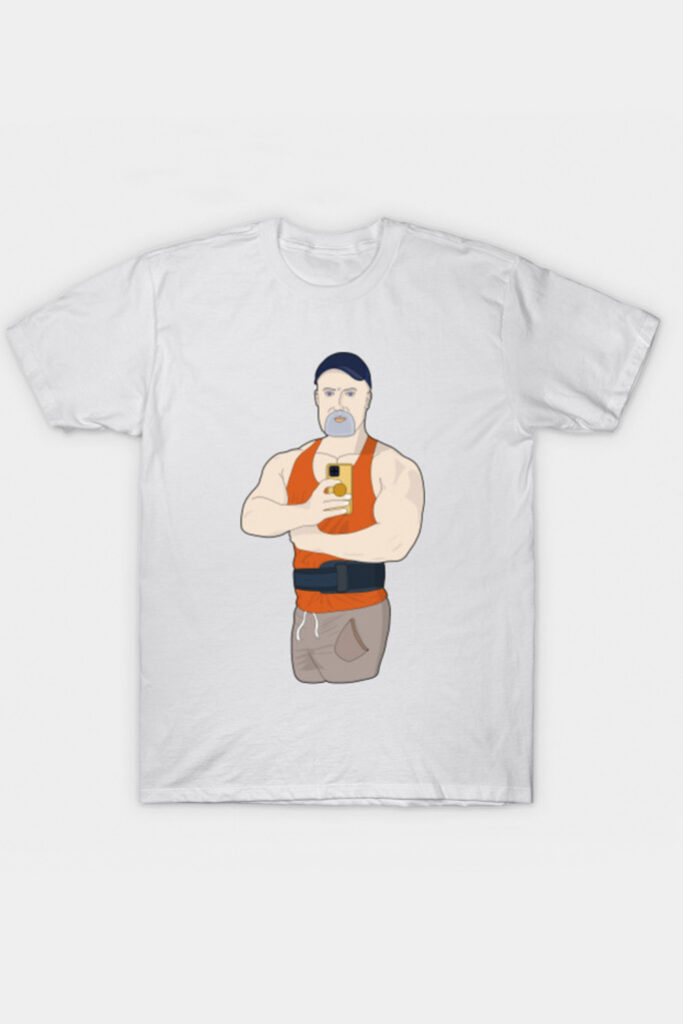 Drawing of a muscular mature man taking a selfie in front of the gym mirror. A great designer for yourself or to give as a gift to friends, family and workout buddies. Muscle Daddy Taking a Selfie at the Gym